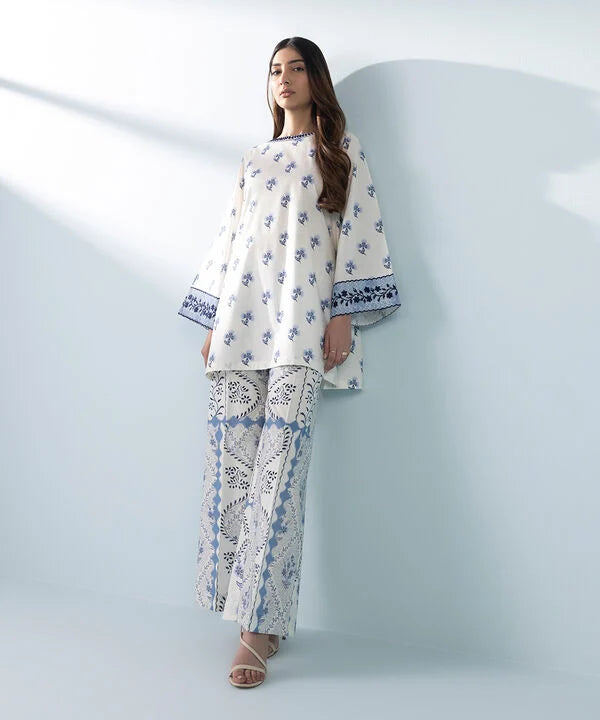 Match with your little one in our embroidered off white and blue, cambric, A-line shirt and printed flared pants.