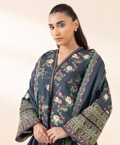 Elevate your style with our two-piece embroidered ensemble in indigo blue featuring a cotton shirt paired with a voile dupatta.