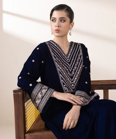 Make heads turn this festive season with our two-piece embroidered raw silk ensemble in navy blue featuring a straight tilla embroidered shirt with a V-neckline paired with flared culottes.