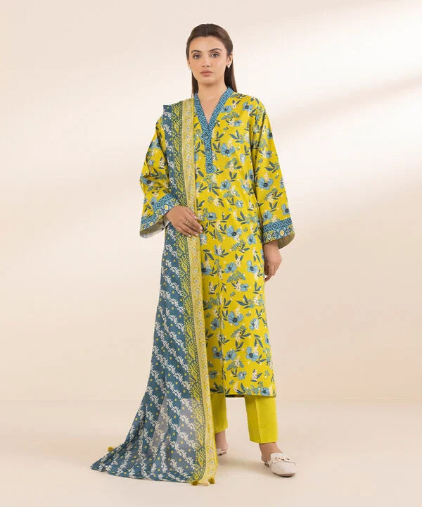 Make a statement with our two-piece printed ensemble featuring a yellow lawn shirt paired with a dull blue voile dupatta.