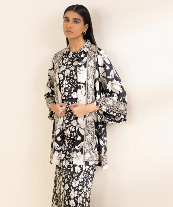 Make a floral statement with our two-piece printed ensemble in black and off white featuring a linen shirt and trousers.