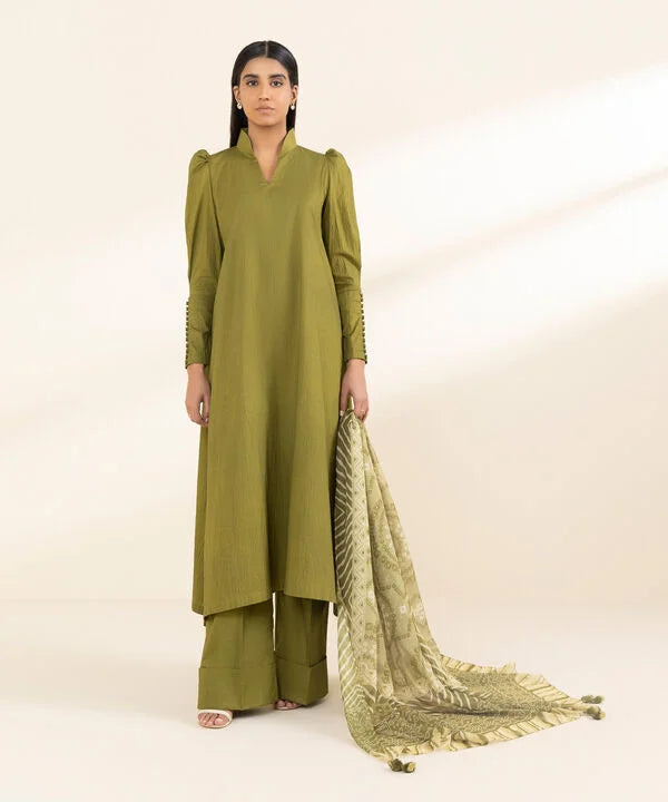 Make a statement with our three-piece ensemble in olive green featuring a dyed seersucker shirt and trousers paired with a printed blended tissue dupatta.