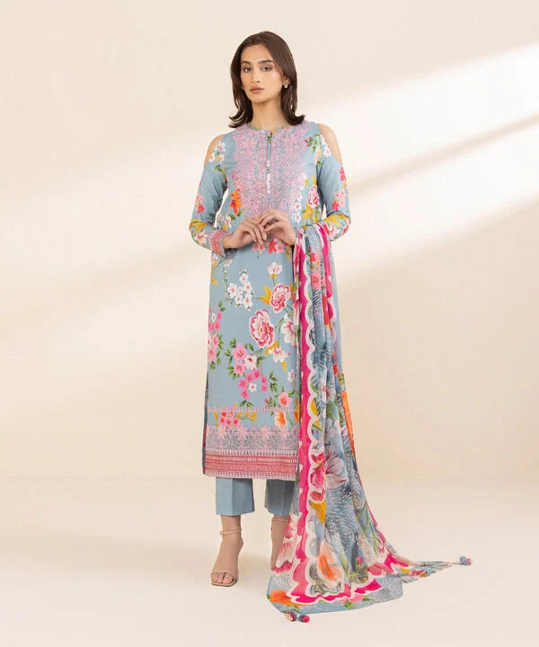 Make a statement with our three-piece embroidered ensemble in aqua featuring a cotton shirt and trousers paired with a printed viscose chiffon dupatta.