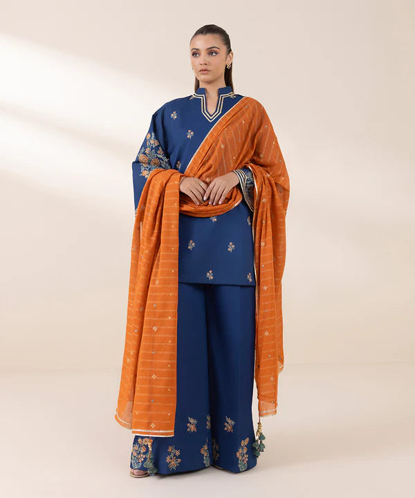 Make a statement with our three-piece embroidered ensemble in red featuring a cotton shirt and trousers paired with a zari voile dupatta in spanish orange.