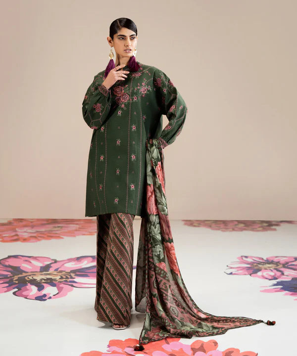 Make a statement with our three-piece embroidered ensemble in dark green featuring a dobby shirt and cotton trousers paired with a bemberg tissue dupatta.