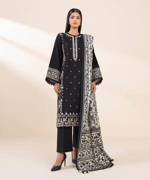 Embrace winter chill with our three-piece black and white light khaddar suit fabric with a printed polyester shawl.