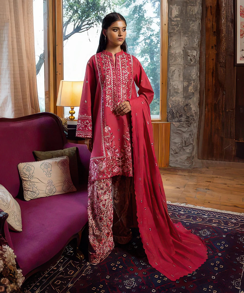 Step out confidently this fall in our pink and ivory three-piece including a light khaddar solid embroidered shirt, trousers and printed dupatta.