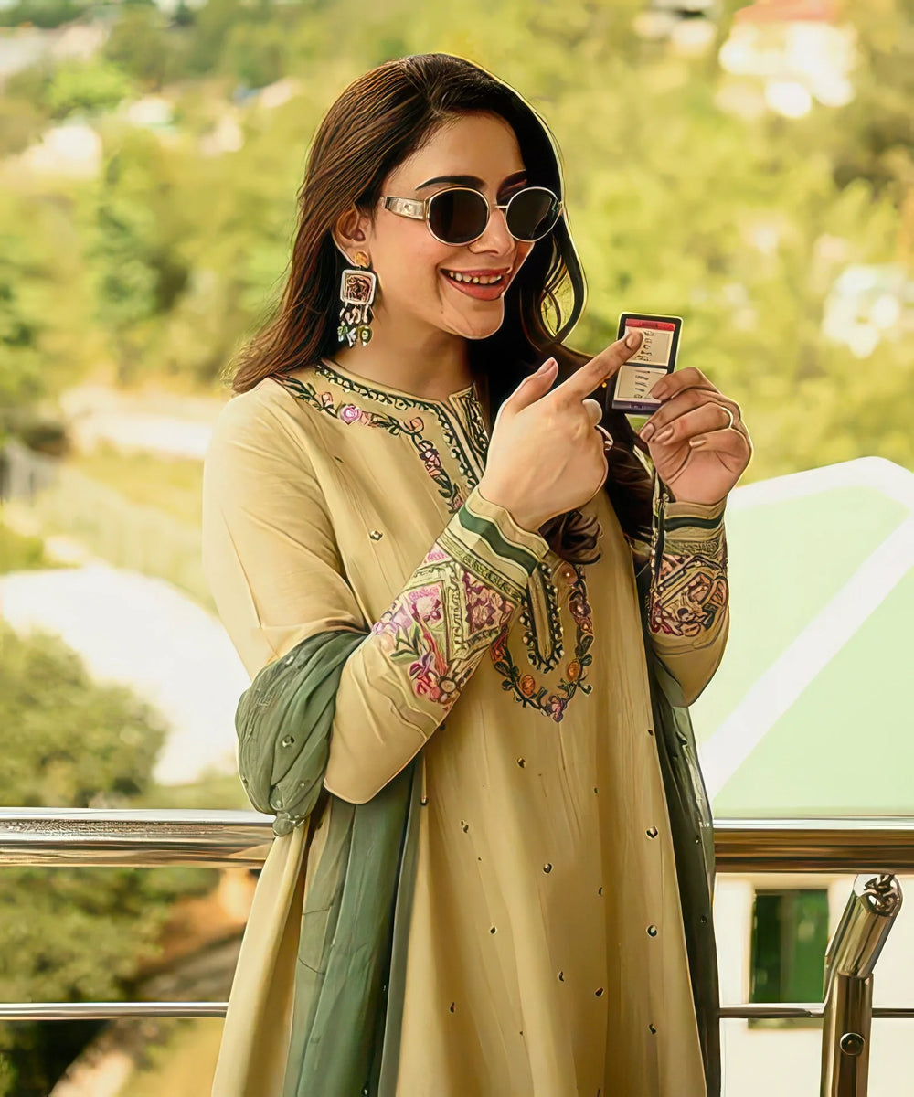 Step out confidently this fall in our beige and sage green three-piece including a light khaddar solid embroidered shirt, trousers and crinkle chiffon dupatta.