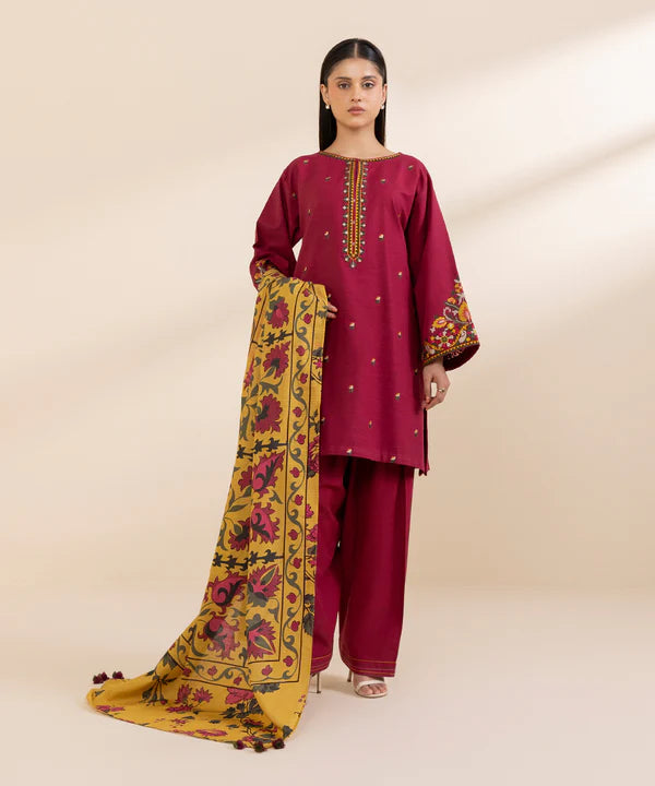 Embrace winter chill with our solid embroidered three-piece fuchsia pink and mustard light khaddar suit fabric with a printed blended shawl.