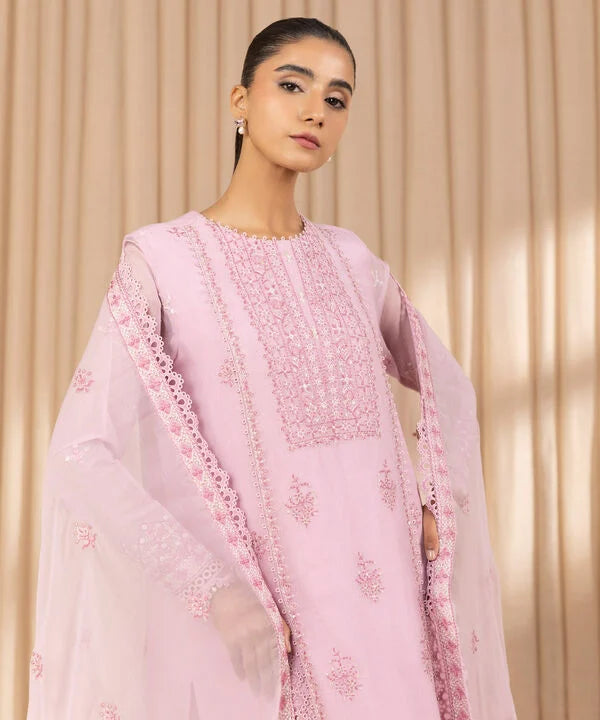 Make a festive statement with our three-piece embroidered ensemble in pink featuring a blended khaddi net shirt paired with raw silk trousers and a crinkle chiffon dupatta.