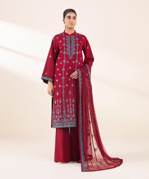 Make a luxurious statement with our three-piece dyed embroidered ensemble in deep red featuring a viscose raw silk shirt and trousers paired with a blended net dupatta.
