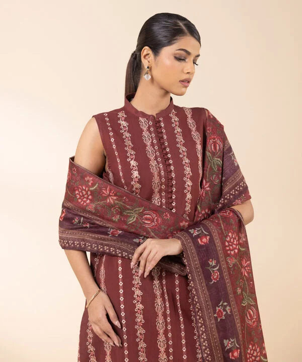 Make a statement with our three-piece ensemble in rust brown featuring a dyed embroidered dull raw silk shirt and trousers paired with a manar dupatta.