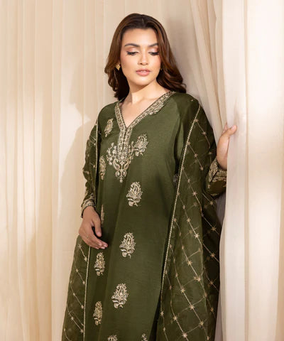 Turn heads this festive season with our three-piece embroidered Olive Green ensemble featuring a raw silk shirt paired with raw silk rousers and a blended organza dupatta.