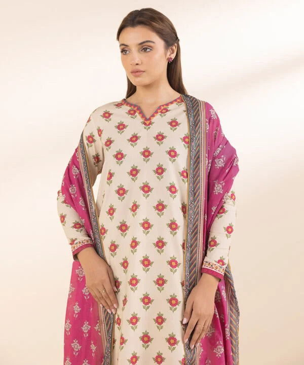Refresh your wardrobe with our three-piece printed ensemble in off white featuring a cotton shirt and trousers paired with a pink voile dupatta.