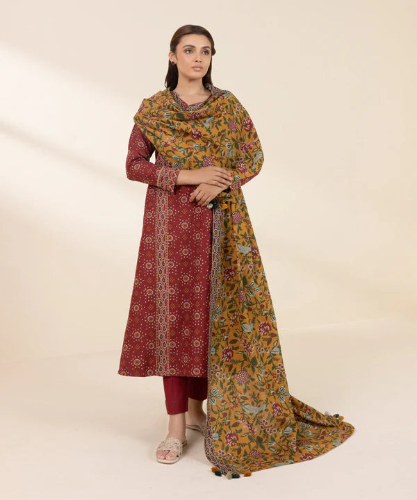 Elevate your style with our three-piece printed khaddar ensemble in deep red featuring a multicoloured dyed dupatta.
