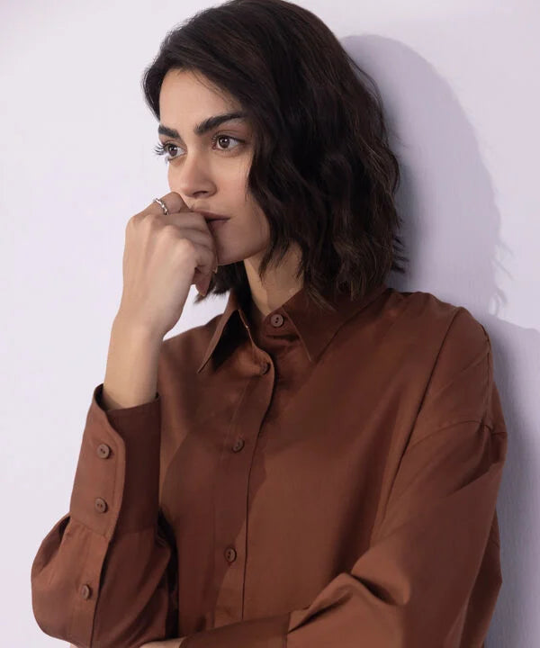 Loose-fit shirt in cotton satin fabric. Collar with button through front opening. Full sleeves with cuffs.