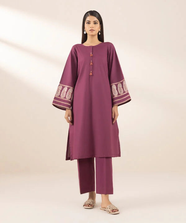 Details: Dyed With Embroidered Front Panel, Dyed Back Panel, Round With A Placket Neckline, Full Sleeves, Calf Length Length