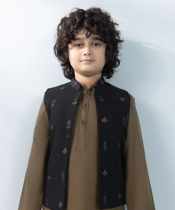 Dress your little one in our embroidered black waistcoat with a band neckline.