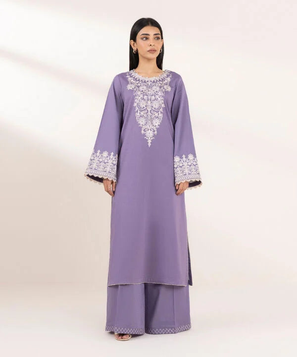 Details: Dyed With Embroidered And Lace Finish Front Panel, Dyed With Embroidered Back Panel, Round Neckline, Full Sleeves, Calf Length Colour:Purple Fabric:Dobby