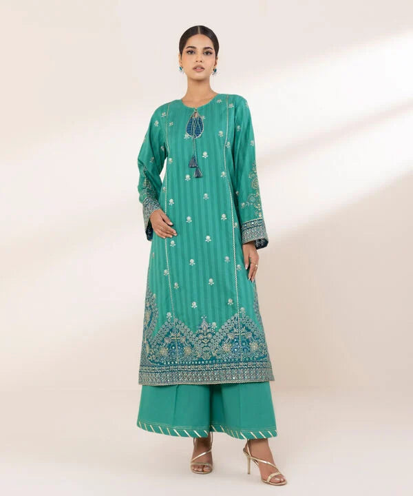 Perfect your festive style with our dyed green, tilla embroidered panelled A-line shirt featuring a round neckline with a keyhole.