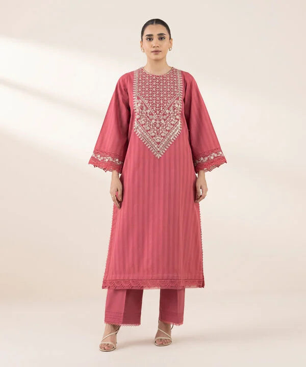 Make a statement with our pink dyed embroidered A-line shirt featuring a round neckline.