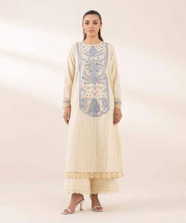 Elevate your style with our beige, dyed embroidered A-line shirt featuring a round neckline.