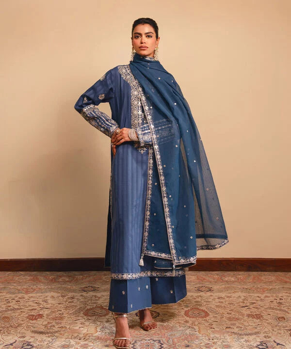 Perfect your festive style with our dyed blue, tilla embroidered A-line shirt featuring a round neckline with a slit.
