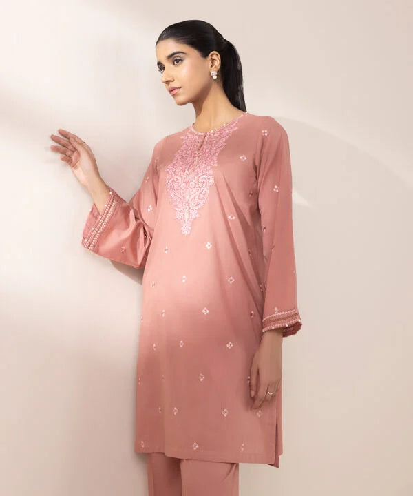 Step out in style in our embroidered pink lawn A-line shirt with a round neckline and slit.