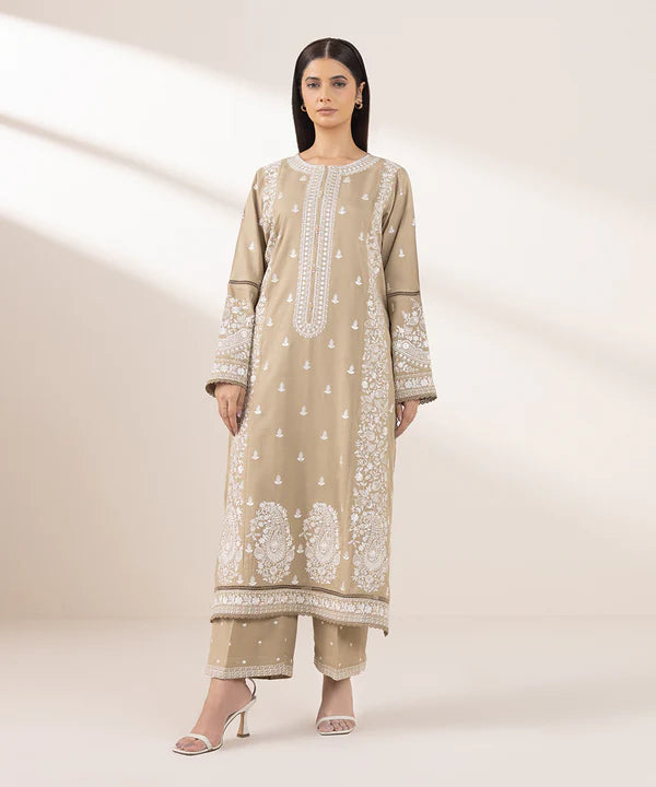 Dyed With Embroidered Front Panel, Dyed With Embroidered Back Panel, Round With A Slit Neckline, Full Sleeves
