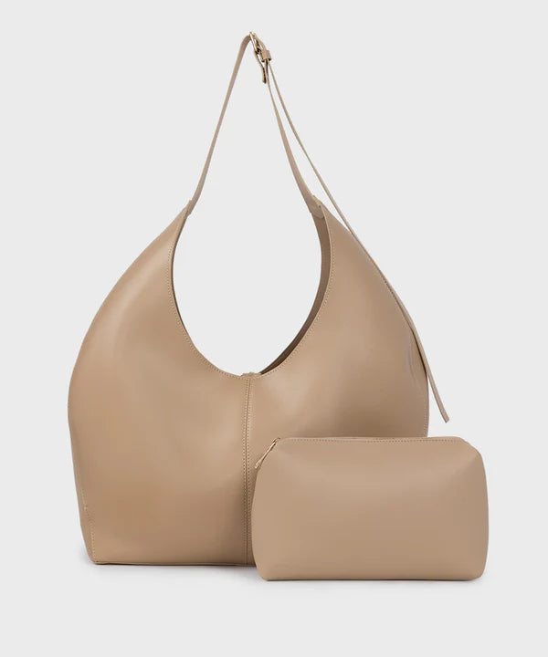 Make a standout statement with our off white, faux leather loose tote bag featuring an inside pouch.