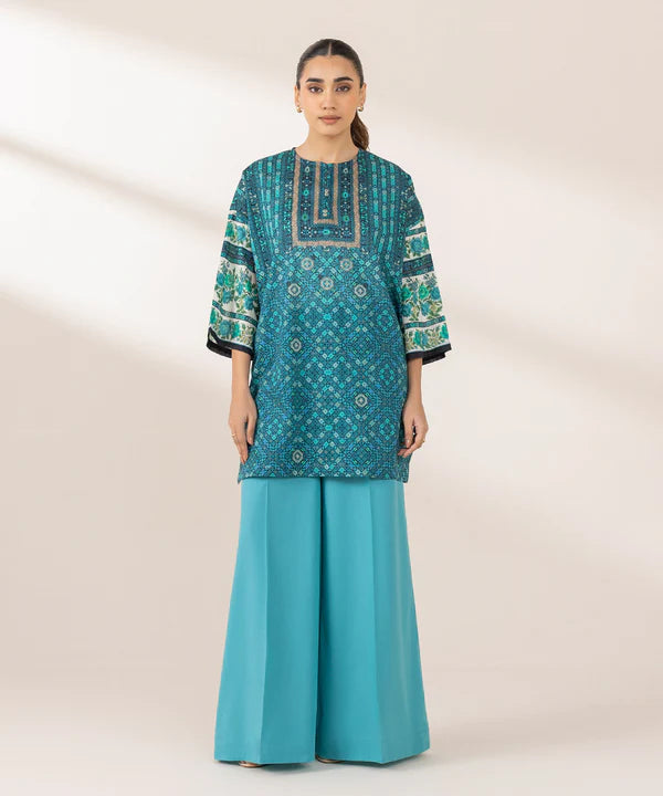 Printed With Button Detail Front Panel, Printed Back Panel, Round With Slit Neckline, Full Sleeves, Above Knee Length