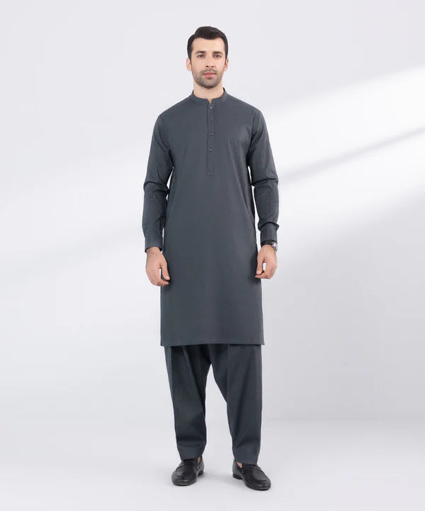 Enhance your wardrobe with our dark grey cotton, straight hem kurta and shalwar with thread detailing.