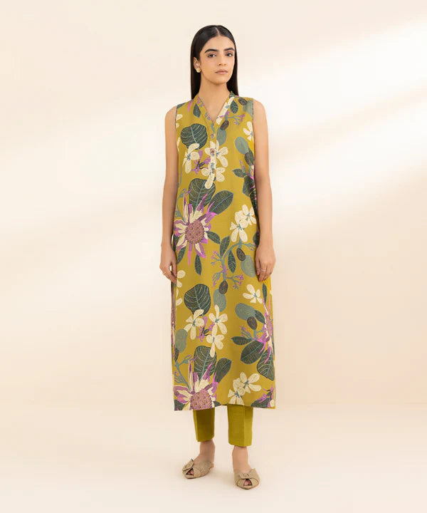 Refresh your style with our printed one-piece mustard khaddar shirt.