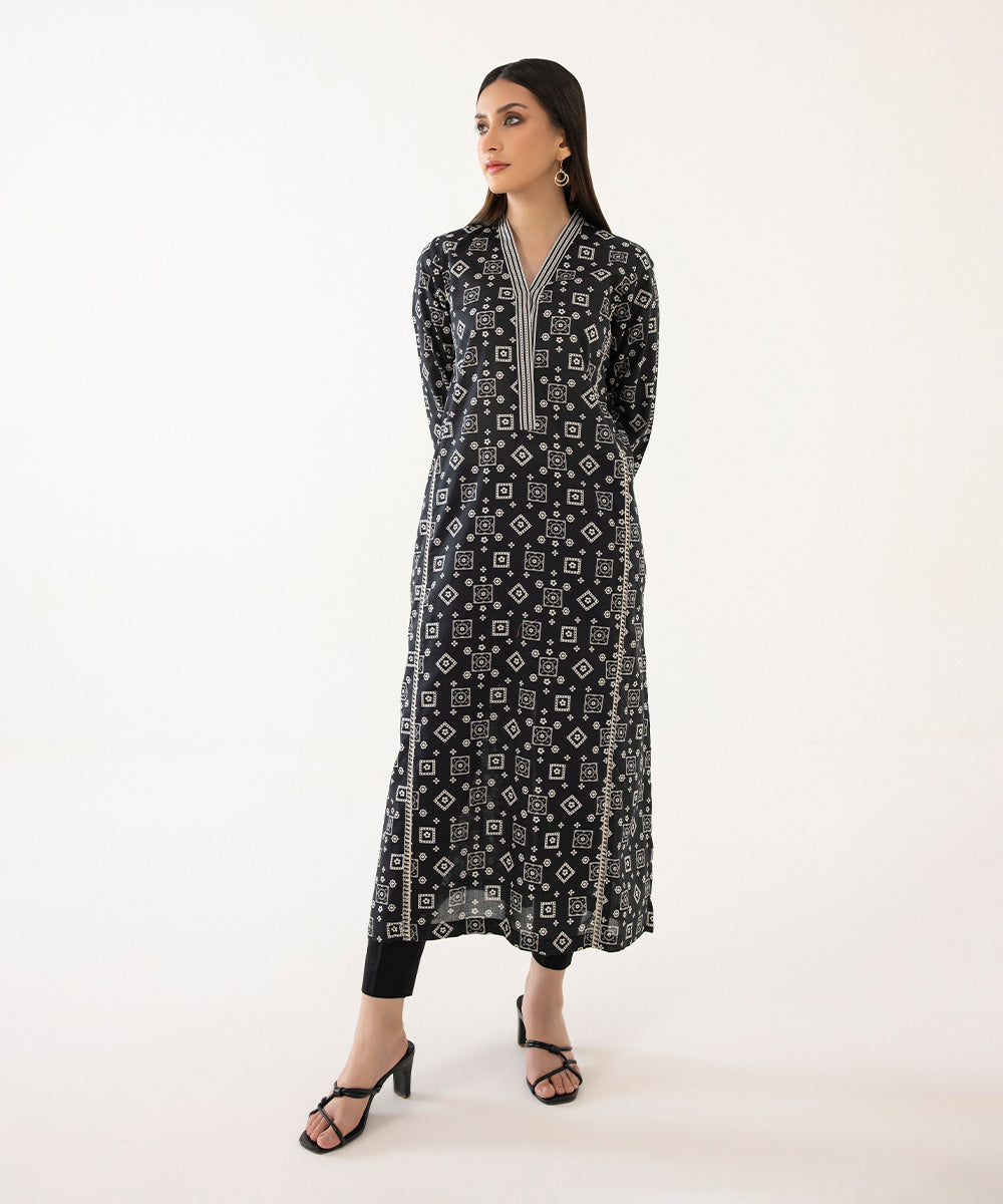 Printed Front With Embroidery, Printed Back, Full Sleeves, V Neckline