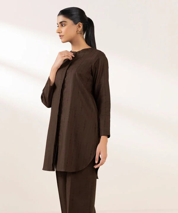 Elevate your style with our printed chocolate brown straight button down shirt featuring a band neckline with a placket.