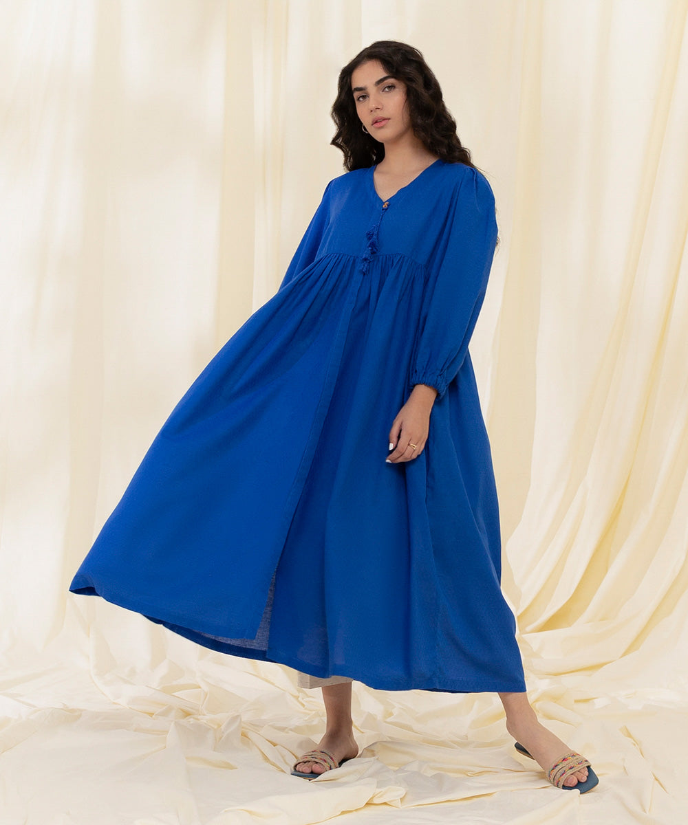 Our blue flared A-line silhouette represents our commitment to using water efficient processes during manufacturing that uses less water as compared to normal fabric processing.