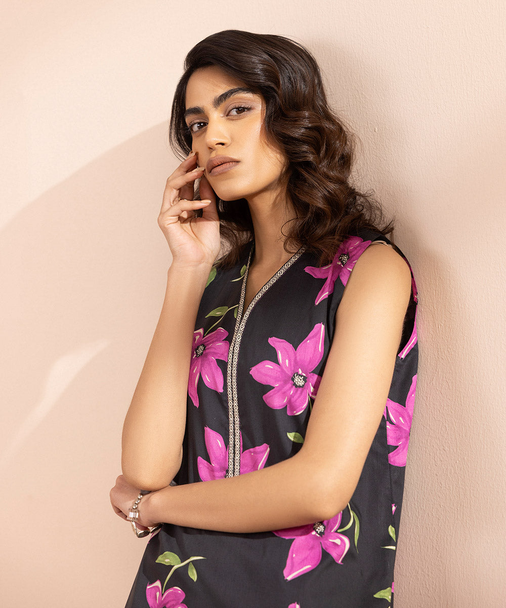Keep it easy breezy in our printed lawn, black and lilac shirt piece featuring florals.