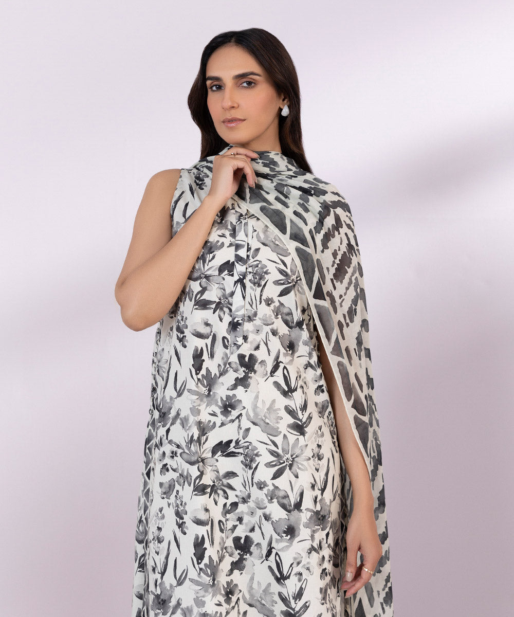 Opt for classic monochromes this Eid in our black and off-white, printed two-piece featuring a lawn shirt and voile dupatta, accentuated with exquisite designs.