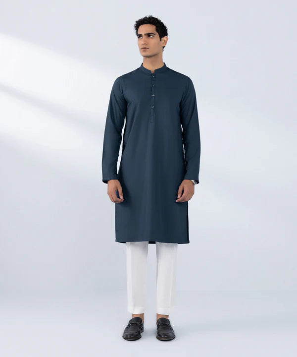 Embrace sophistication with our meticulously tailored solid blue, wash and wear kurta.